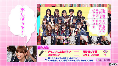 For six minutes on August 30 (Tuesday) from 24:31, NTV's two digital channels (041 and 042) will trial-broadcast a spin-off of popular NTV quiz show "TORE!" as part of its multi-channel broadcasting. Viewers select correct answers to the questions by choosing either channel. (i.e.: if the answer is "yes," choose channel 041 or if the answer is "no," choose channel 042)