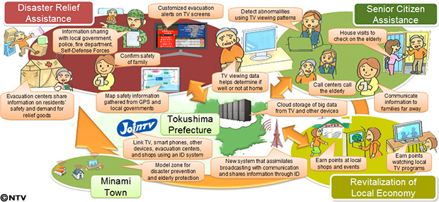 JoinTV is an NTV-developed platform that links television programs to social media, giving audiences a brand new viewing experience. Launched in June 2012, JoinTV can be enjoyed through both smart phones and TV datacasting. Faced with the risk of a Nankai Trough earthquake striking at any time, Tokushima Prefecture is taking preemptive measures to prevent any loss of life in the event of such a disaster. The prefecture is also taking steps to protect and ensure the wellbeing of its senior citizens. JoinTV is a highly versatile application that, when connected to TV sets via the internet and assimilated to the latest Information Communication Technology (ICT), is the ideal choice for Tokushima Prefecture's life-saving initiatives.