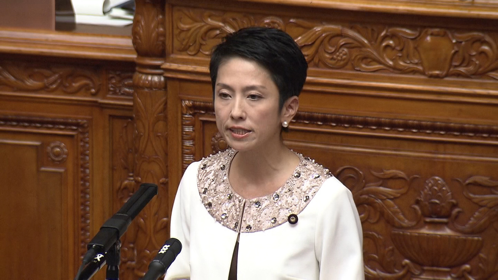 Democratic Party leader Renho Murata questions Prime Minister Shinzo Abe on his commitment to promoting women in Japanes...