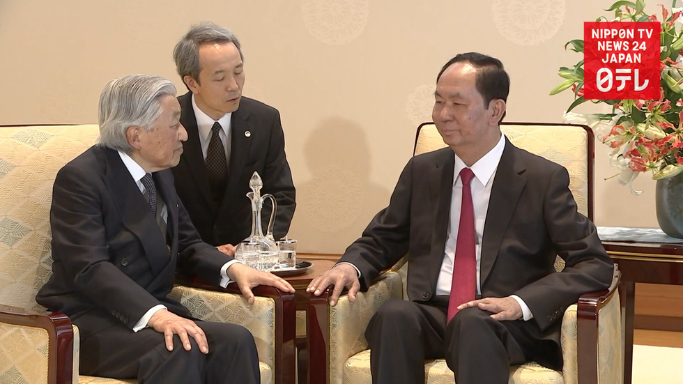 The Emperor and Empress welcome Vietnam's President and his wife to the Imperial Palace.