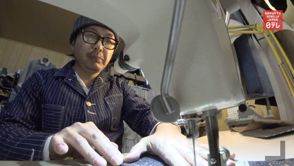 At a workshop in Oita, southwest Japan, a man is hand-sewing traditional blue jeans, one by one.