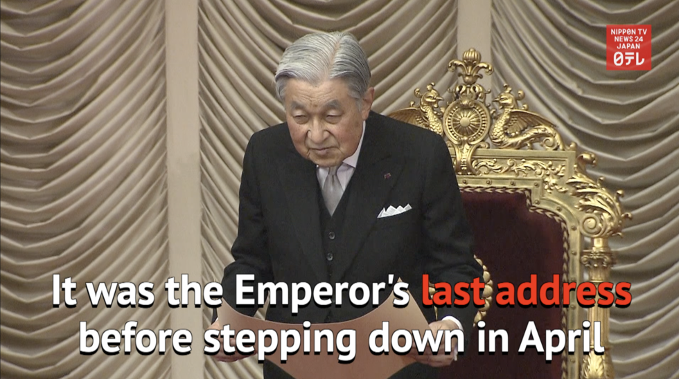 Emperor Akihito gives his last Diet opening address to launch the final ordinary session of the Heisei era.