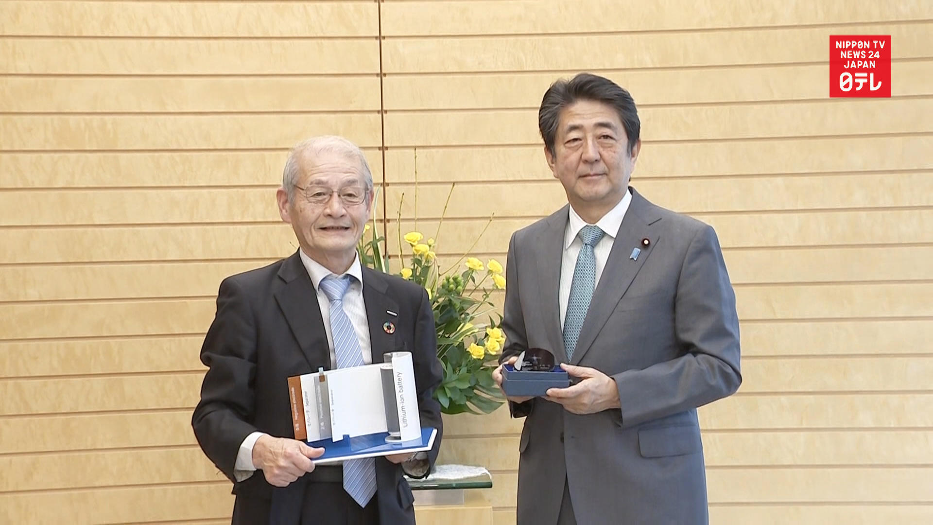 Lithium-ion battery pioneer and winner of the 2019 Nobel Prize in Chemistry Akira Yoshino meets with Prime Minister Shin...