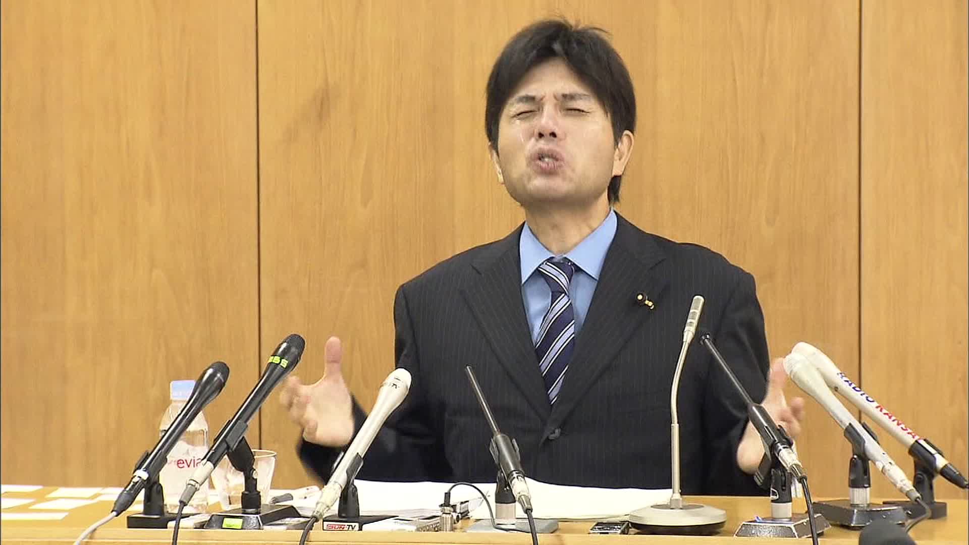 A Japanese politician who gained notoriety for his repeated tearful outbursts at a news conference has resigned.