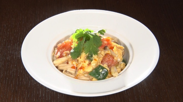 (6)塩、砂糖、チキンパウダーで味を整えて、3分ほど煮たら水溶き片栗粉でとろみをつける。