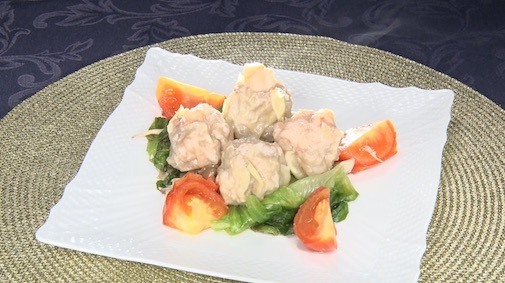 5. フライパンに野菜を敷いて焼売を上に並べ、水100ccほど加えて蓋をし、中火で6分ほど蒸せば出来上がり。