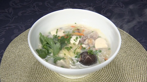 7. ラーメンを茹でて、6のスープを加え、ネギや香菜のみじん切りなどの薬味をのせて出来上がり。 -