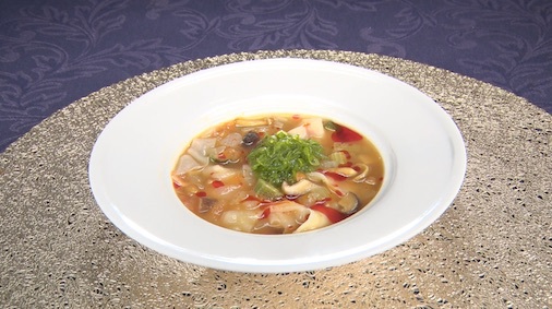 3.塩・鶏ガラスープのもと・酢で味を整え、1センチほどに切ったワンタンの皮を入れて