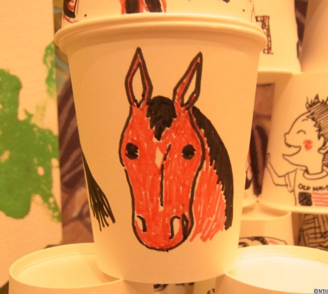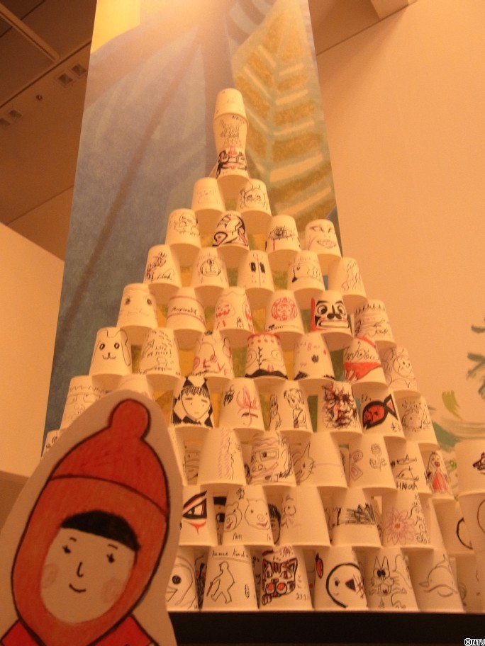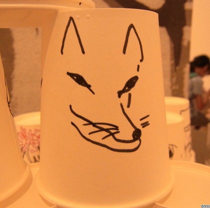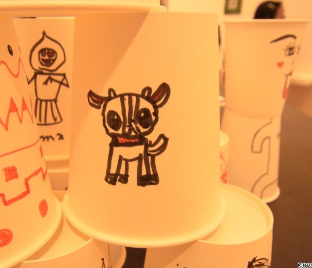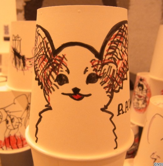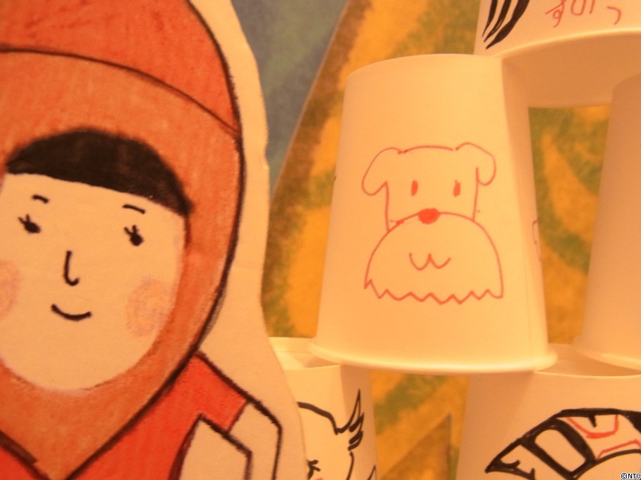 紙コップに自分の好きな人や動物などを描いて積み上げて