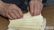 3枚の紙を張り合わせた扇面に型紙を当て、折り目をつけます。