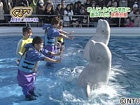 目の前のプールで泳ぐイルカやクジラ、オタリア(アシカの仲間)と触れ合え、