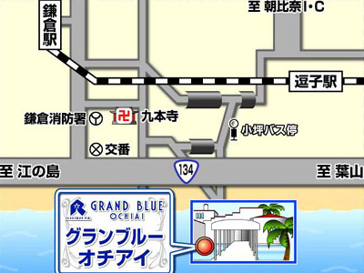 ・ JR横須賀線逗子駅北口より京浜急行バス「小坪経由鎌倉行き」にて 「小坪海岸」下車、徒歩5分