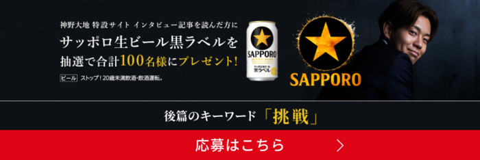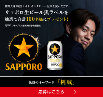 応募は締め切りました。たくさんのご応募ありがとうございました。記念すべき第100回大会を迎える箱根駅伝の開催を控えお届けする「SAPPORO × 日本テレビ 特別企画 #まだ見ぬスターたちへ。」では、神野大地にインタビュー。神野は、青山学院大学在学中の第91回大会、第5区にて快走し区間新記録を樹立。“3代目山の神”と呼ばれた。 インタビューは前篇「スタートは篇」、後篇「挑戦とは篇」として、第100回大会へ出場するランナーたちへのエールを聞いた。現役のランナーはもちろん、日常生活においてもさまざまな障壁を乗り越えようとする時に共感できる、励まされる言葉も多数。当記事では「挑戦とは篇」を公開。