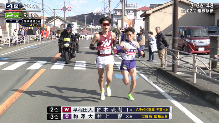 序盤、2位の城西大・桜井選手(4年)を3位の駒澤大・村上選手(3年)が追い、3km(以下kmは区間のkm数)過ぎには並走する形に。5km目前、駒澤大・村上選手が前に出て2位が逆転。