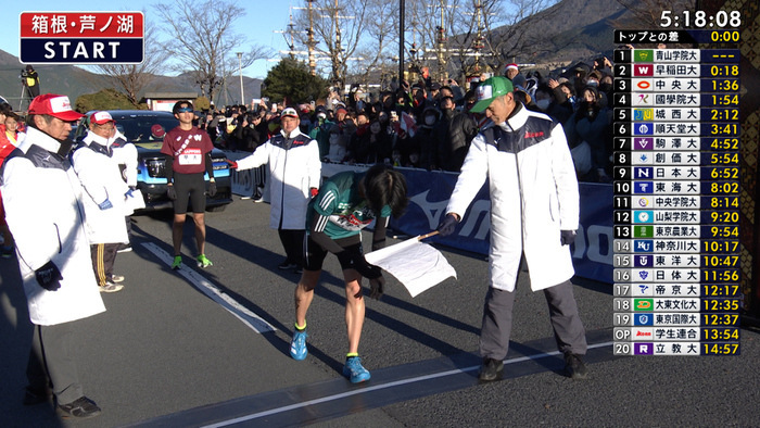 午前8時に箱根・芦ノ湖を青山学院大・石川選手(1年)がスタート。続いて18秒差で早稲田大・山﨑選手(3年)がスタート。