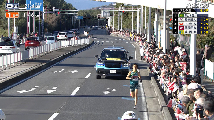 15.6km地点の遊行寺坂では、1位青山学院大と2位國學院大の差は1分33秒。3位の中央大は1位と2分35秒差。
