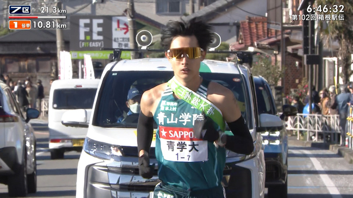 平塚中継所まであと2.9kmの大磯では、2位國學院大は1位青山学院大を1分49秒差で追う。小田原中継所地点での3分23秒差を大きく詰めている。