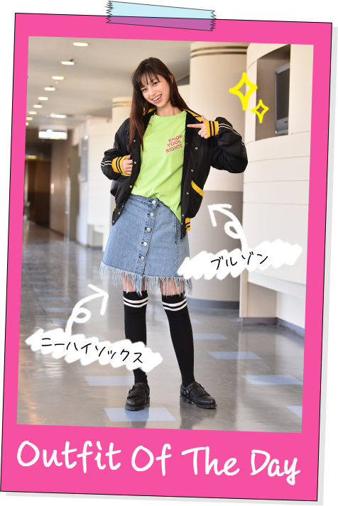 スポーツMIXのファッションは1つ挿し色を入れる感じが定番だと思いますが、結構大胆に何色かカラーを入れて、やんちゃっぽく見える“派手め”がはるかの着こなしのキーワードです。インナーをモノトーンで落ち着かせず、ライトなグリーンを合わせたことで春らしい明るさも出せますね。