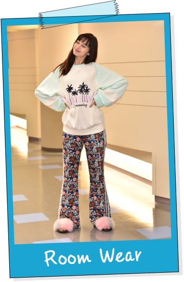 南国風の開放感あふれるイラストが印象的なトップスは、肌触りの良いタオル地。サイズ感もゆったりですね。仕事で気を張っている分、やっぱり部屋にいるときはリラックスできるように、素材が柔らかくらくちんで、自然と気持ちが上がるアイテムをセレクトしたいですよね。