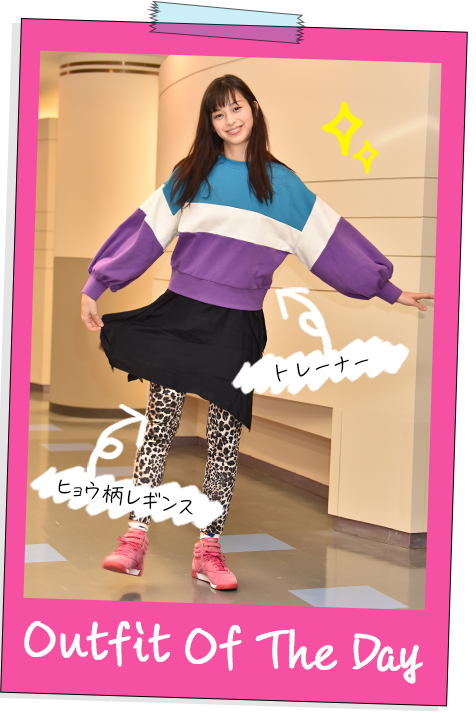 はるかは基本的にトップスがビッグシルエットでボトムスが細身。ここでもヒョウ柄レギンスで元ヤンのワルっぽさを加えていますが、サイドのラインがあることでスポーツテイストにまとまります。