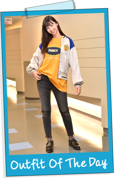 仕事帰りにスーパーに立ち寄ったシーンでのカジュアルなスタイル。アウターは光沢感のあるスカジャンタイプですが、デザインが刺繍ではなくロゴなのでハードすぎずに着られます。ビタミンカラーのインナーが、はるかの元気っぽさを象徴していますね。