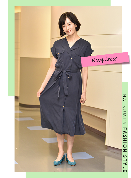 1話から履き回しているパンプスはブルーグリーンのような綺麗なカラーで、派手に見えて結構何にでも合うんです。落ち着いたワンピースに黒や紺のパンプスだと地味になりがち。トレンドのイエローやパープルなどカラーの靴を一つ買い足すだけで、同じ服でも違って見えると思います。