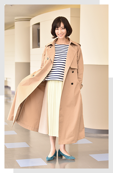 仕事を終えて、本城と居酒屋で飲んでいるシーンのコーデ。1話で着たトレンチコートと違ってこちらはしっかりしたハリのある素材。シフォンのふんわりしたプリーツスカートを合わせて、夏美のコーデのポイントの“女性らしい柔らかさ”を意識しています。