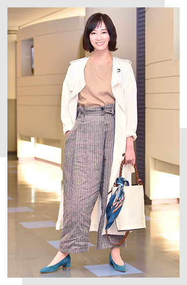 ハイウエストのパンツは麻素材のストライプ柄で、これだけでイマドキ感がアップ!トレンチがキレイめな印象なので、パンツはシワ加工でハズし、抜け感を大事にしています。