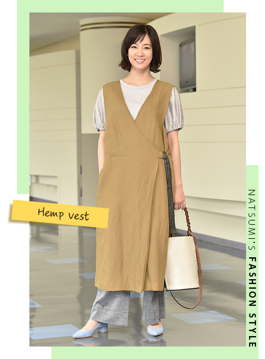 はるかと一緒に貴子を見舞いに訪れたシーンでのコーデ。メンズライクな麻のベストをメインにしたレイヤードスタイルです。シンプルに見えてベルトの存在感が小技の効いたポイントに。