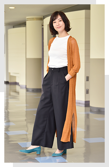 パンツはハリ感があるワイドパンツ。素材の選び方で柔らかいカーディガンとのバランスを意識しています。どこかに1点柄を取り入れることが多い夏美ですが、こちらはシンプルスタイルが好きな方にもオススメの正統派コーディネートです。