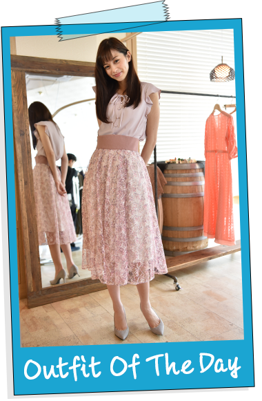 夏美は寒色系でクールにまとめましたが、はるかは甘めのサーモンピンクでカラーを統一。スカートのウエスト部分が切り替えでバックはレースアップなので、トップスのデザインに合わせて前後を使い分けできます。このタイプはウエストの細さをかなりアピールできますよ。