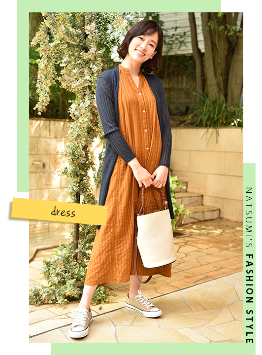 休日にはるかとショッピングに出かけた夏美。通勤ファッションもオシャレな夏美ですが、このデザインのワンピースはオフならではですね。レース素材の軽やかなノースリーブワンピースで、茶系とネイビーの組み合わせで落ち着いた印象に。夏はワンピース一枚でサンダルを合わせれば、リゾート感たっぷりのコーデにチェンジできますよ。