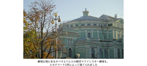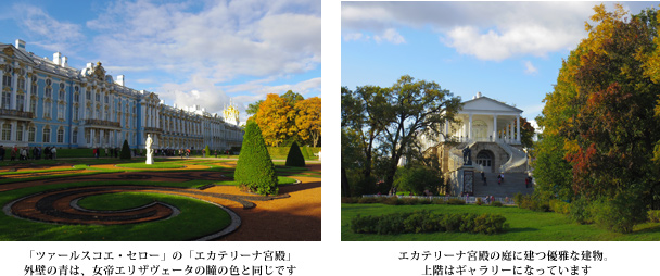 現在サンクトペテルブルクには、エカテリーナ2世が初期の愛人オルロフのために建てた「大理石宮殿」や、有能なパートナーだったポチョムキンに贈った「タヴリーダ宮殿」など、豪華な建築を見ることができます。サンクトペテルブルク郊外では、皇族たちの避暑地「ツァールスコエ・セロー(皇帝の村)」の「エカテリーナ宮殿」などが、エカテリーナ2世が大々的にかかわった建築物のひとつです。