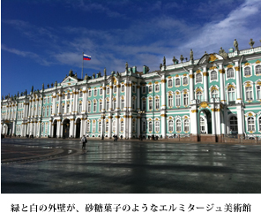 そして、旧参謀本部の向かい側に建っているのが、我らがエルミタージュ美術館!黄金の窓飾りがきらめく白と緑の外壁が、日本の「わび・さび」なんて美意識知らないね、って感じで延々と続いているのですが、実はこの壁、時代ごとにいろんな色に塗りかえられており、共産主義時代はなんと!赤色だったとか……。そもそも1764年の創設当初は、旧参謀本部と同じような(?)薄い黄色だったそうなので、日本人的には「オリジナルの色 にしとけばいいのに」と思うのですが、どうやらロシア人には、そういうこだわりはないようです。