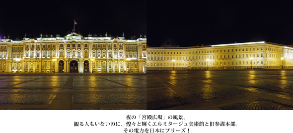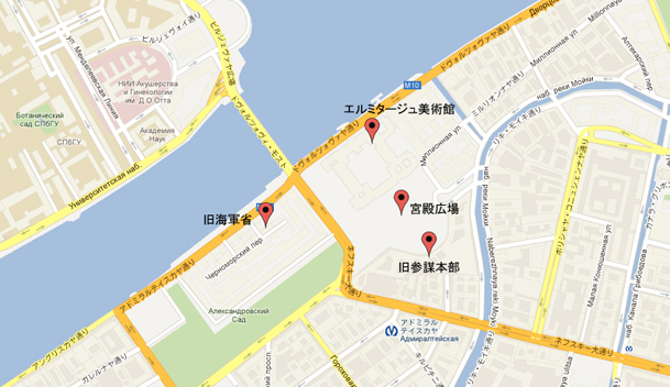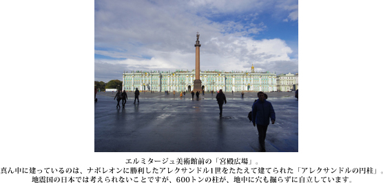 以前から何度か地図に出てきたように、エルミタージュ美術館は、ネフスキー大通りの突き当り、「宮殿広場」に位置しています。ここは、旧海軍省と旧参謀本部、そしてロマノフ王朝の宮殿だったエルミタージュ美術館に囲まれた広場で、こんなに広い!