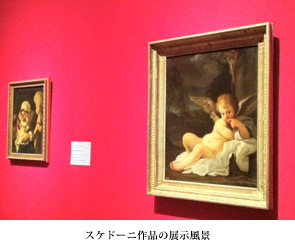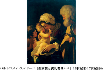 このキューピッド、おしゃまな眼差しといい、ポニョッとした幼児体型といい、本当にかわいらしいですよね。本展ではその隣に、同じ作者の清らかな聖母子像《聖家族と洗礼者ヨハネ》が展示されており、これだけ観ると、スケドーニって子どもを描くのが得意そうだし、なんとなく「良さそう」な人に見えてしまうかもしれません。