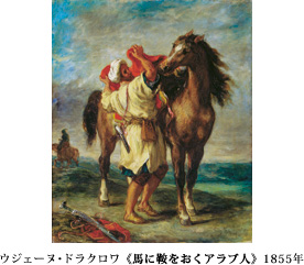 たとえば、ロマン派の巨人ドラクロワ。彼はその華麗な色彩表現で、「色彩の魔術師」とも言われます。まあ、印象派以降の色とりどりの絵画を知っている私たちには、彼の画面の「魔術師ぶり」はイマイチよくわからなかったりするのですが……。とはいえ、《馬に鞍をおくアラブ人》に見られる、鮮やかな緋色の使い方や激しいタッチは、つるんとした仕上がりの重厚感あふれるアカデミックな絵画とは違って、観る者の感情に訴えかけるものがありますね。