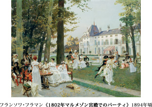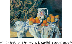 パリ郊外にあるマルメゾン宮殿の庭園でのパーティの様子を描いた作品です。ナポレオン一世が友人や取り巻きたちと鬼ごっこをしている図が面白く、写真のように緻密に描かれていることにも驚きました。現在はあまり知られていませんが、作者のフランソワ・フラマンも、アカデミスムの画家と考えていいようです。歴史画を制作することが大好きで、ここに出てくる実在した人物は、当時の肖像画を見ながら描かれ、衣装から雰囲気まで正確に再現されているのだとか。個人的には、この絵の制作年が、セザンヌの《カーテンのある静物》とほぼ同時期なのがツボでした。
