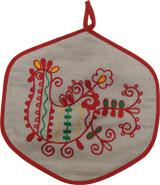 ロシア北西部にあるアルハンゲリスク市の伝統的な刺繍があしらわれた鍋つかみ。原色の刺繍糸がとても華やかで小花と鳥のステッチがロシアン・フォークロアを感じさせます。