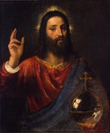 16世紀ヴェネツィア絵画を代表する巨匠ティツィアーノの晩年の作で、この人間味あふれるキリストの右手の仕草は祝福をあらわしている。左手に支えられた球形のクリスタルガラスは、万物の支配者としてのキリストの象徴である。
