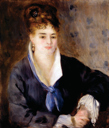 印象派の画家として活躍し、「虹色のパレット」で女性の美を表現したルノワール。しかし本作品では珍しく、青や黒を白と対比させ、それによって都会的な雰囲気が生まれている。モデルが誰であるかは判明していない。