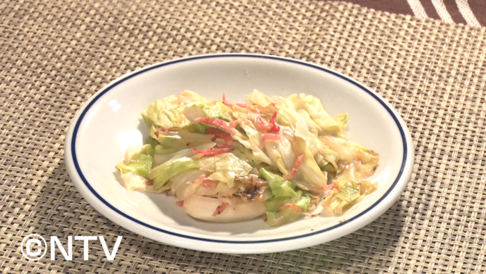 ②フライパンに油を入れ、キャベツと干し海老をソテーする