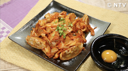 4、餃子とキムチを炒め合わせて完成