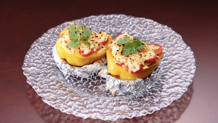 ④肉を詰めたパプリカをラップで包み600Wの電子レンジで2分加熱する