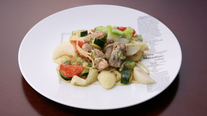 ⑦パスタと野菜が茹で上がったらお湯を切り、サバ缶とトマトをボウルに入れ