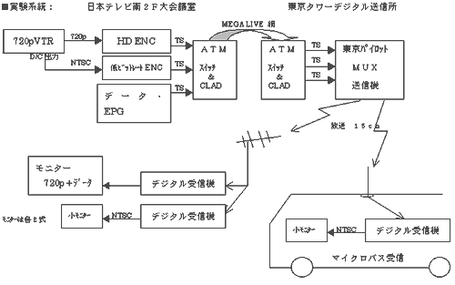 日本テレビでは、H12年12月8日(金)、地上波デジタル放送の特徴を考慮した「移動体向け放送も含めた地上デジタル放送の実放送サービスを視野に置いた放送」というテーマで公開実験を行いました。 日本テレビ本社で、送出システムと受信映像(HDとその移動体向けサイマルSD)の見学を行い、その後、マイクロバスで日本テレビ周辺を走行して受信を確認し、実験は成功しました。 実験見学者数は、約250名、そのうち移動受信を体験した人は約220名でした。 ■ 実験目的: @ 固定受信向けのHDTV 720p番組を放送する一方、SDTVに変換し低ビットレートの移動受信向け放送を同時に実現する。現実に放送可能なパラメータによる2階層伝送のサービスモデルを構築する。 AHDTV番組に連動したデータ放送、EPG放送を同時に行う。 BNTV本社大会議室をマスターに見立て、エンコーダ出力信号を光ファイバーにて東京タワーデジタル送信所に伝送、放送を行う。 ■実験パラメータなど: @ 固定受信階層:10セグメント:64QAM 7/8 伝送ビットレート 16.38Mbps A 移動受信階層: 3セグメント:16QAM 1/2 伝送ビットレート 1.87Mbps HDTV(720p:14Mbps)固定+データ放送(約2Mbps)固定+サイマル移動体(約1Mbps)