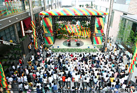 *なお、大屋根広場(写真:右)には現在開催中の日テレ・イベント『GO!SHIODOMEジャンボリー ゥンチャカ♪』での“ゥンチャカ・ステージ”が設置されています。ステージ上では様々なSHOWが繰り広げられ連日、大勢のお客様に楽しんでいただいております。 (http://www.ntv.co.jp/shiodome/)