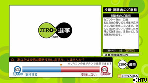 ホームページ「ZERO×選挙2007」内では、各党党首のこれまでの発言や、党首討論会の様子、また最新の政治ニュースを動画でご覧いただけると同時に、「みんなで政治を語ろう!」コーナーや、「選挙の基礎知識&選挙のビックリ!?豆知識」、また過去の選挙結果など、選挙までの期間そして投票日当日もじっくりとお楽しみいただけるコンテンツ満載です。