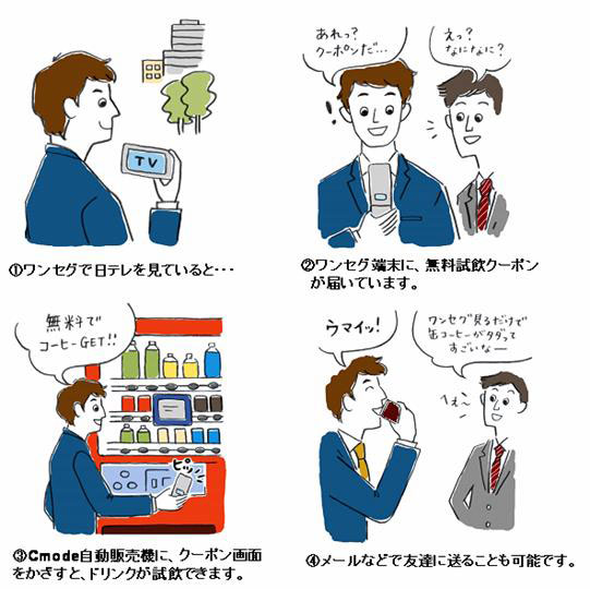 そこで今回、両社ではワンセグをご利用の方に向けて自動的に携帯電話内にキャンペーン情報がクーポンとして蓄積される機能「ワンセグinfo」※1を提供することにより、これまで以上に手軽にキャンペーンサイトへのアクセスを可能とする広告手法を構築いたしました。さらに本実験では、日本コカ・コーラの提供するCmode対応自動販売機(愛称:シーモ)※2 との連携により、「ワンセグ」⇒「キャンペーンサイト」⇒「商品購入」を繋げるシームレスな広告を実現いたします。
