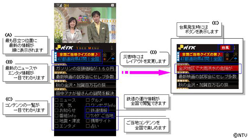 同時に、日本テレビネットワーク各社向けに配信しているワンセグのデータ放送コンテンツをリニューアルします。日テレワンセグのノウハウを生かし、トップページをワンセグに適したレイアウトに変更します。